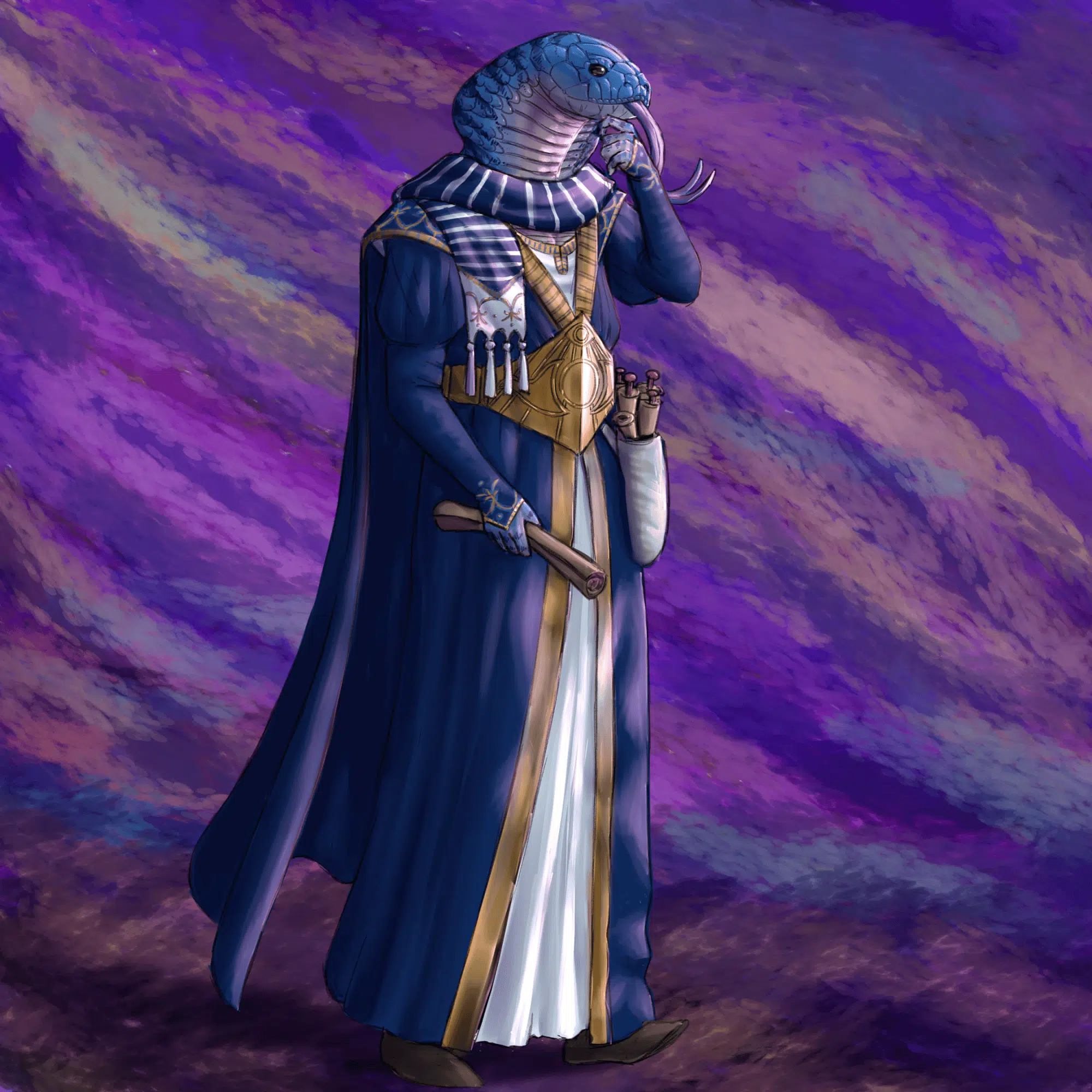 A slave for the first 17 years of his life, this crafty serpent-man found favor and fortune as a courier and information broker in Carngrad. After successfully emancipating the city’s slaves (in favor of an exploitative profit system), he was chosen to lead the armies of Carngrad in the Prime Dominion War. Now he is a war hero and inter-realm crime lord on the Path to Glory.