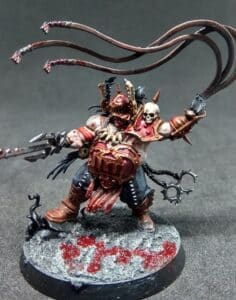 Kazgrim has spilled blood by the tide full and he has bathed in no less. So blessed by his blood god is he that his very soul defies the beck and call of Nagash. So long as there is sufficient blood sacrificed on the battlefield, Kazgrim's rigored body draws it in, revels in it and revitalizes his body anew as if pulled fresh from a bloody womb of Khorne. His mastery of blood allows him to also bring some of his followers back from the brink of death, allowing them the chance to spill blood once more for their unquenchable patron.