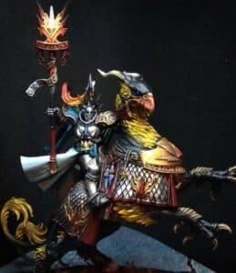 When a tide of chaos raiders attacked the city, he was denounced as a cursed scholar and having brought doom to their esteemed city. His fellow scholars betrayed him, hoping to oust him from the council and exile him from the city. Their screams echoed the halls of the citadel chambers as he used ancient blood rituals to tear their skulls from their writhing bodies. He had mastered the skull runes and with this, he could control a rift into the chaos realm by the skulls he bore. His journey eventually led him into the ranks of Lord Aichmos, bearing the banner of the blood secrator and bringing the swirling madness of the chaos realm wherever his fetish skulls followed.