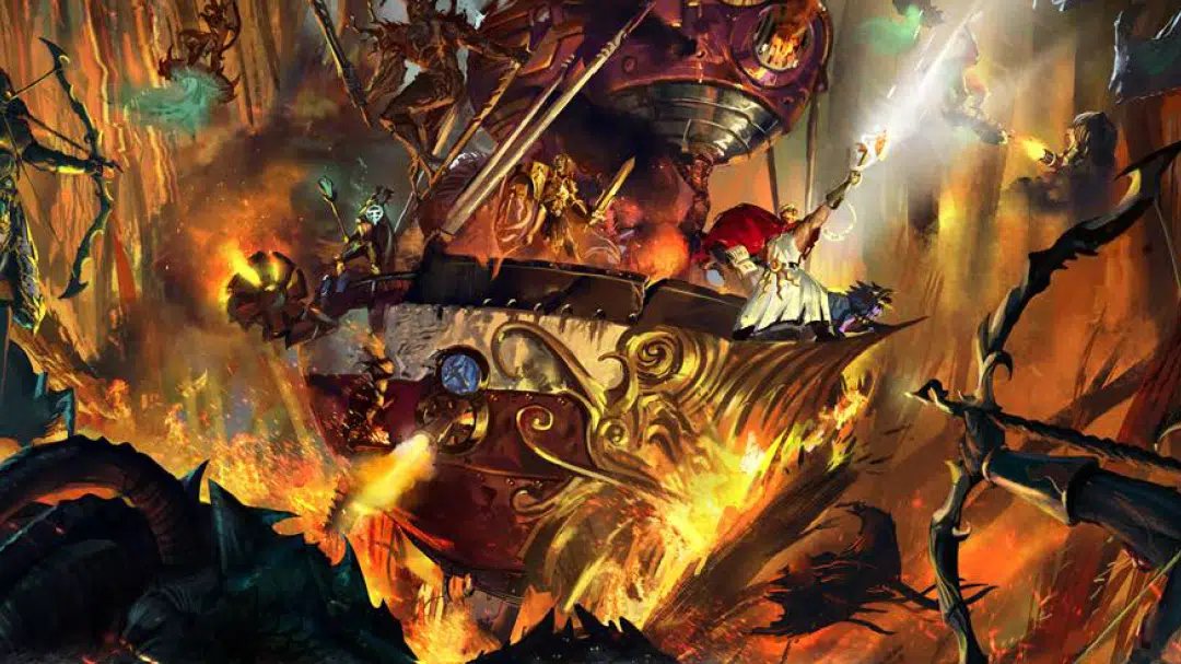 The Grund (Duardin for ‘hammer’) is an Arkanaut Ironclad, one of the powerful aether ships of the Kharadron Overlords. The party can make use of its weapons to help in the defence of the ship. Its heavy sky cannon (4 + S Damage, Aetheric, Loud, Two-handed, Range (Long)) is useful against the attacking Tzeentch daemons, but the racks of grudgesettler bombs (Aetheric, Blast (5), Loud, Range (Long)), skymines, and drill launchers (Soulbound, page 112) may have disastrous effects if not used carefully. The crew itself are experienced fighters. There are a dozen armed Duardin on board. Some wield boarding weapons (Skyhooks, Grapnel Launchers, and other basic weapons) while others are armed with Vulcaniser Pistols and Swords of various make. Brokka herself is armed with an Aethermatic Volley Gun, and keeps a Hammer nearby for close combat.