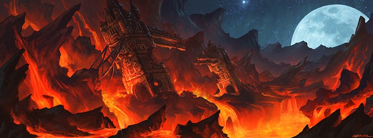 Vogg’s horde consists primarily of a subspecies of rockgut troggoth that have adapted to the lava flows and magma geysers of the area, whose blood runs as hot as the molten rock among which they make their lairs. Sometimes these “lavaguts” will grow large enough to rival the size of a dankhold troggoth. When the troggflow ranges from the mountains, they are often accompanied by fellwater troggoths, who are inexplicably comfortable in the tar pits and prismatic springs of the surrounding lowlands. Lately, troggoth raids have risen sharply, and Spearian officials fear that some malign intelligence is driving them.